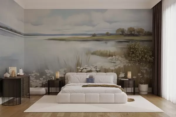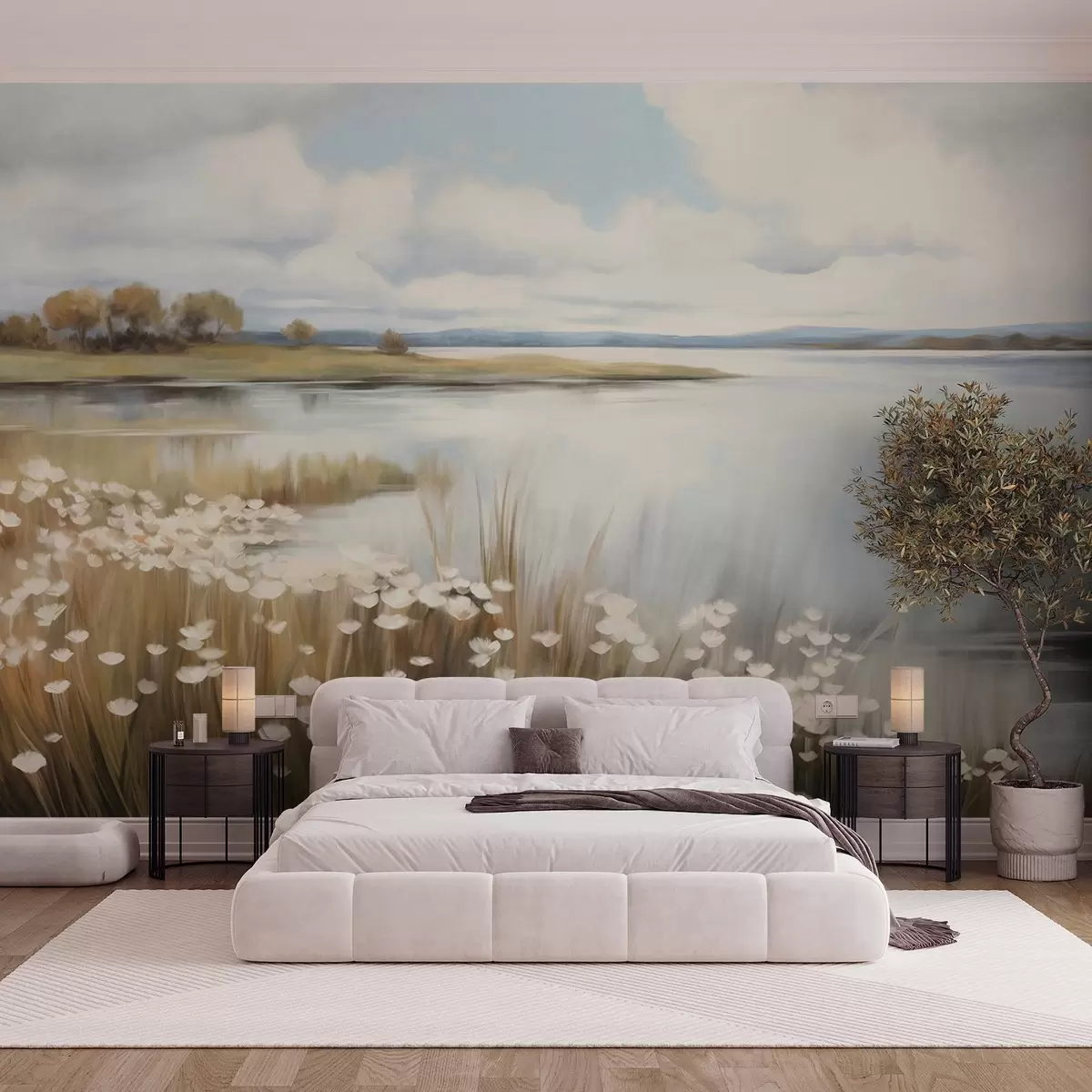 Fototapeten Strukturierte Landschaft, Feld mit weißen Blumen und hohem Gras, ein See im Hintergrund, ein grasbewachsener Hügel mit Bäumen, sanfte Farben N° w09530