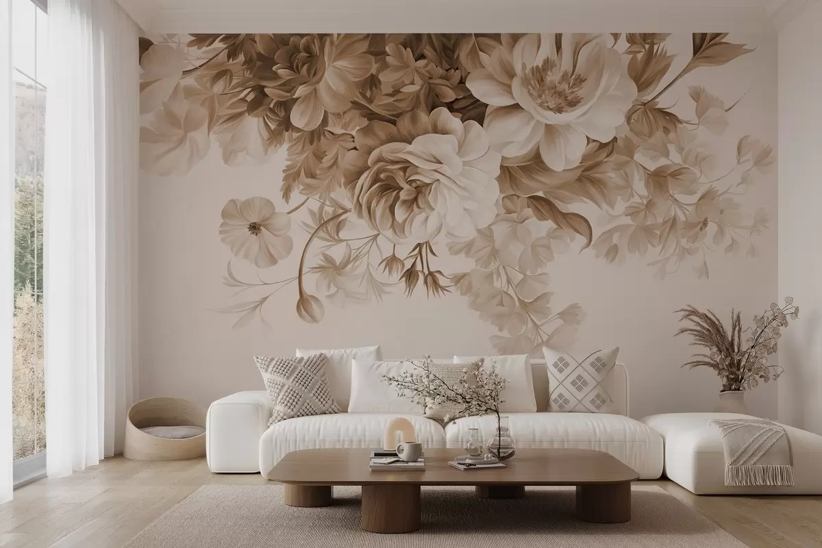 Fototapeten Vintage-Blumenarrangement mit Rosen, Pfingstrosen und anderen strukturierten Blumen mit Blattwerk auf hellem Hintergrund N° w09532v1