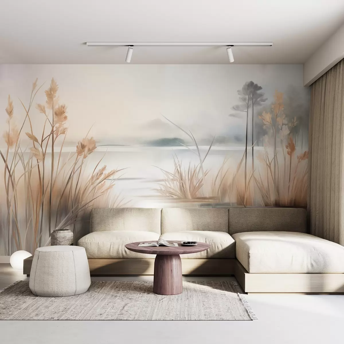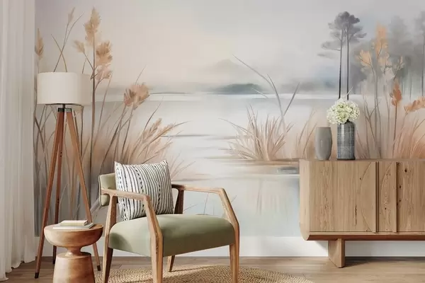 Fototapeten Landschaft mit einem See und hohem Gras im Vordergrund, Bergen im Hintergrund, sanften Farben, strukturiert N° w09534