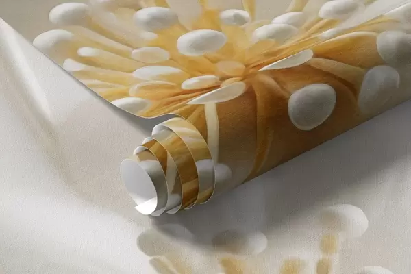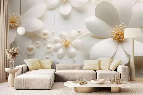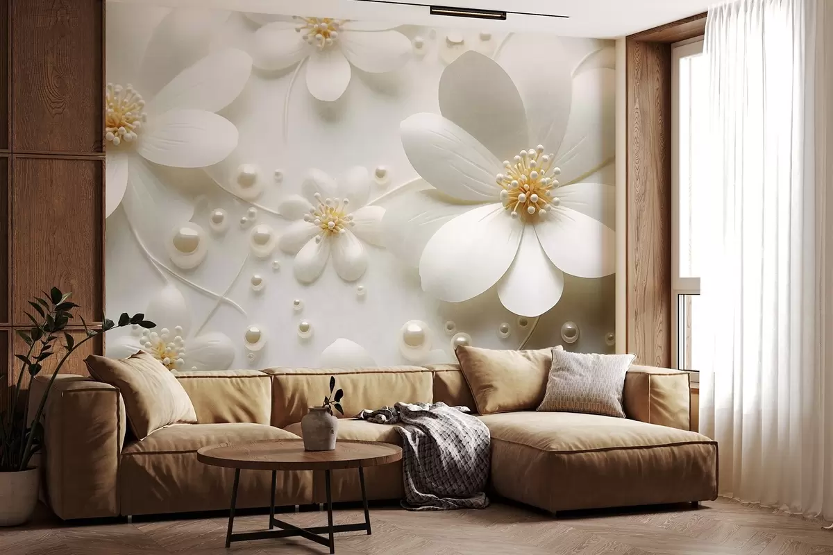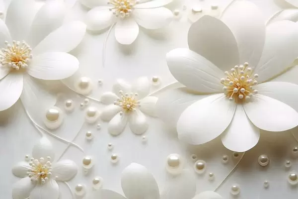 Fototapeten Weiße Blumen mit Perlen auf weißem Hintergrund, elegantes und minimalistisches Design, strukturiert N° w09535