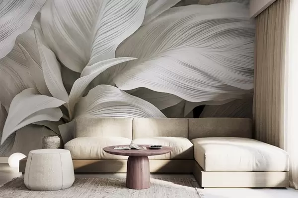 Fototapeten Große, strukturierte weiße Blätter mit markanten Adern, die sich überlappen und Tiefe schaffen N° w09536