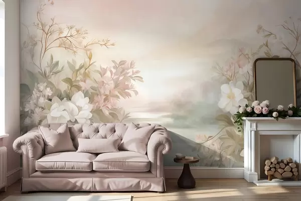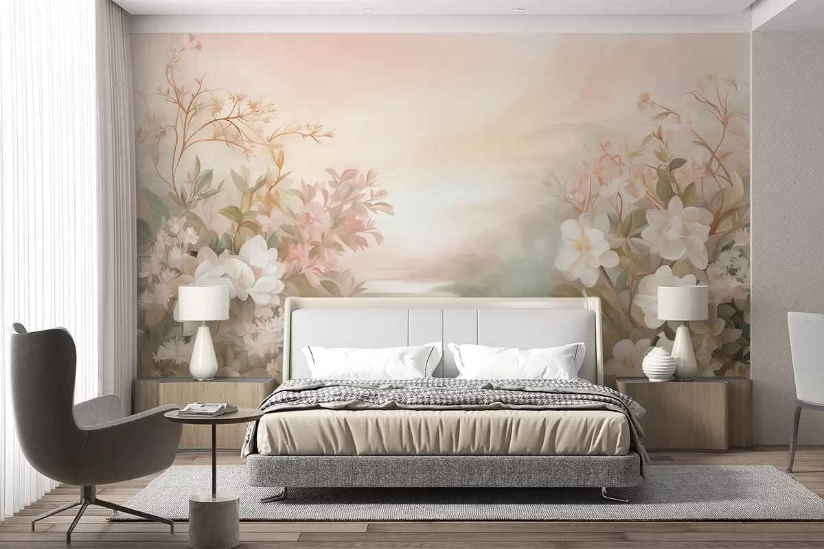 Fototapeten Eine Landschaft mit einem Fluss, umgeben von Blumen und Pflanzen, sanften Farben, rosa Himmel, Aquarell-Texturstil N° w09537