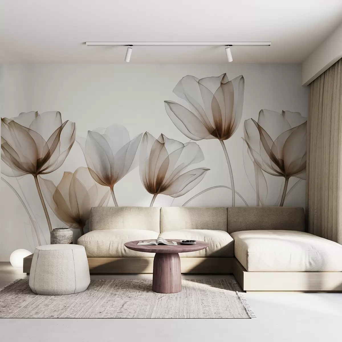 Fototapeten Durchscheinende braune und weiße Tulpenblüten mit langen Stielen vor hellem Hintergrund, zarte und strukturierte Blumenkunst N° w09538v1