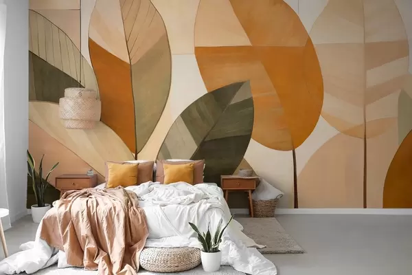 Fototapeten Abstrakte große Blätter in Orange-, Braun- und Grüntönen, strukturiert, vor hellem Hintergrund angeordnet N° w09539