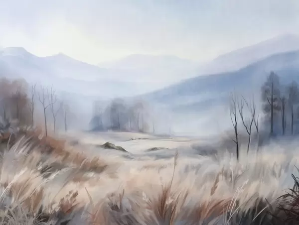 Fototapeten Strukturierte Landschaft mit trockenem Gras im Vordergrund und Bäumen im Hintergrund, mit Bergen in der Ferne N° w09542
