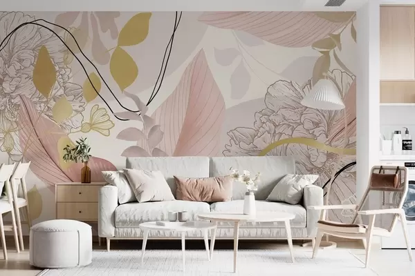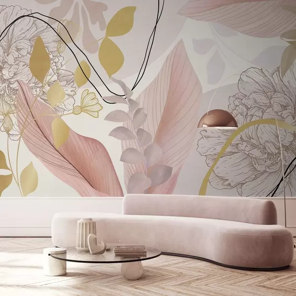 Fototapeten Abstrakter Blumendruck mit großen Blättern in gedeckten Rosa- und Gelbtönen mit dünnen schwarzen Linien und weißen Blumenumrissen N° w09544v1