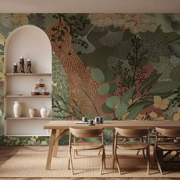 Fototapeten Abstrakte Collage mit botanischen Elementen wie Blättern, Blumen und organischen Texturen in Grün- und Brauntönen N° w09545