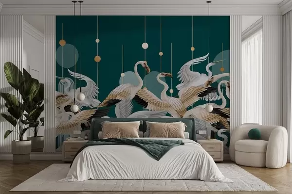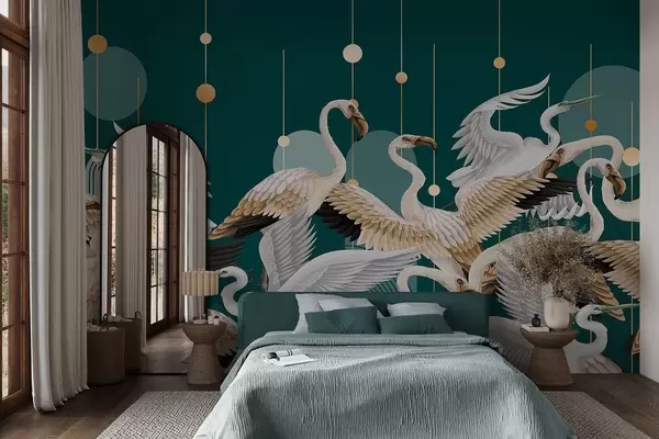Fototapeten Eine Schar weißer Flamingos mit zarten Flügeln vor einem dunkelblaugrünen Hintergrund mit gelben Linien und Kreisen N° w09546