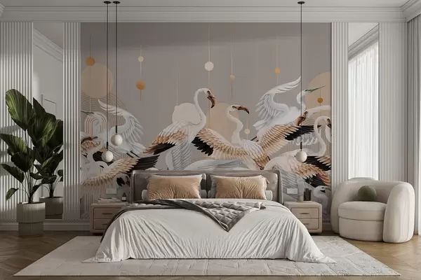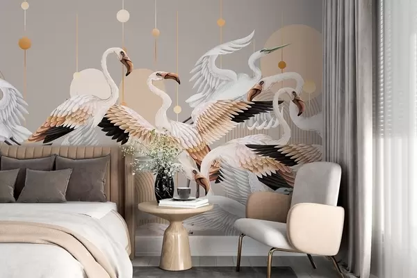Fototapeten Eine Schar weißer Flamingos mit zarten Flügeln vor einem neutralen Hintergrund mit gelben Linien und Kreisen N° w09546v1