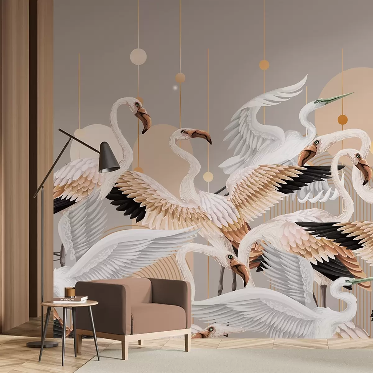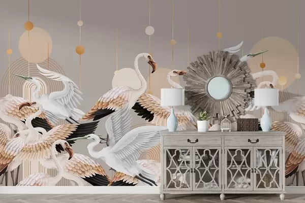 Fototapeten Eine Schar weißer Flamingos mit zarten Flügeln vor einem neutralen Hintergrund mit gelben Linien und Kreisen N° w09546v1