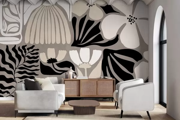 Fototapeten Moderne, minimalistisch stilisierte Blumen und Blätter in Beige, Schwarz und Weiß, strukturiert auf grauem Hintergrund N° w09547