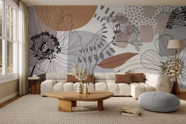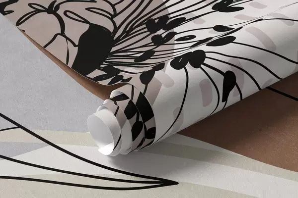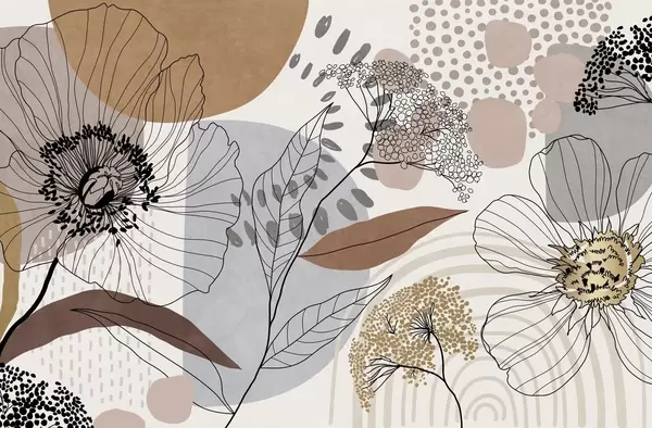 Fototapeten Abstrakter Blumenprint mit Linienzeichnungen von Blumen, Blättern und organischen Formen in gedeckten Braun-, Beige- und Grautönen N° w09548