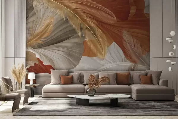 Fototapeten Abstrakte, strukturierte, große, fließende Formen in Creme- und Rostfarben mit zarten, gelben, beigen und braunen Federn N° w09549