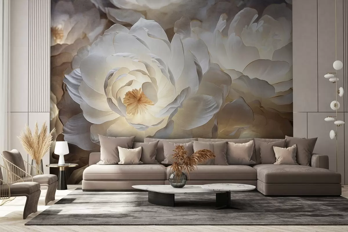 Fototapeten Große, weiße Fantasie-Pfingstrosenblüten mit gelber Mitte, sanfter Beleuchtung und zarten, strukturierten, mehrschichtigen Blütenblättern. N° w09550