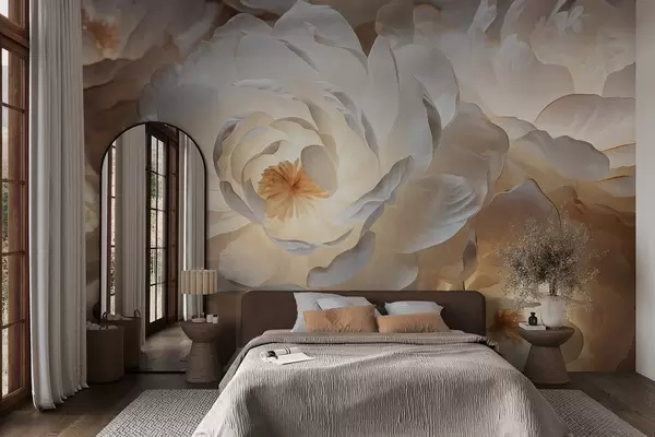 Fototapeten Große, weiße Fantasie-Pfingstrosenblüten mit gelber Mitte, sanfter Beleuchtung und zarten, strukturierten, mehrschichtigen Blütenblättern N° w09550