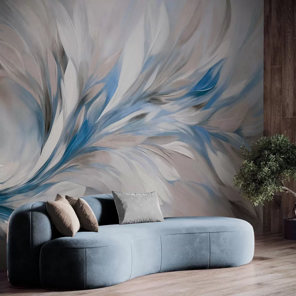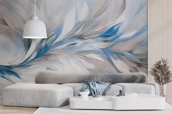 Fototapeten Abstrakter Malstil mit weißen, blauen und grauen strukturierten Pinselstrichen vor einem weichen, hellen Hintergrund N° w09552v1