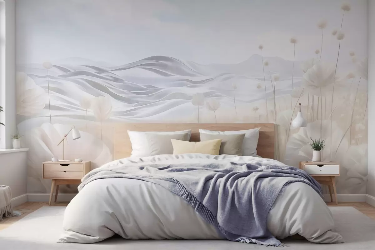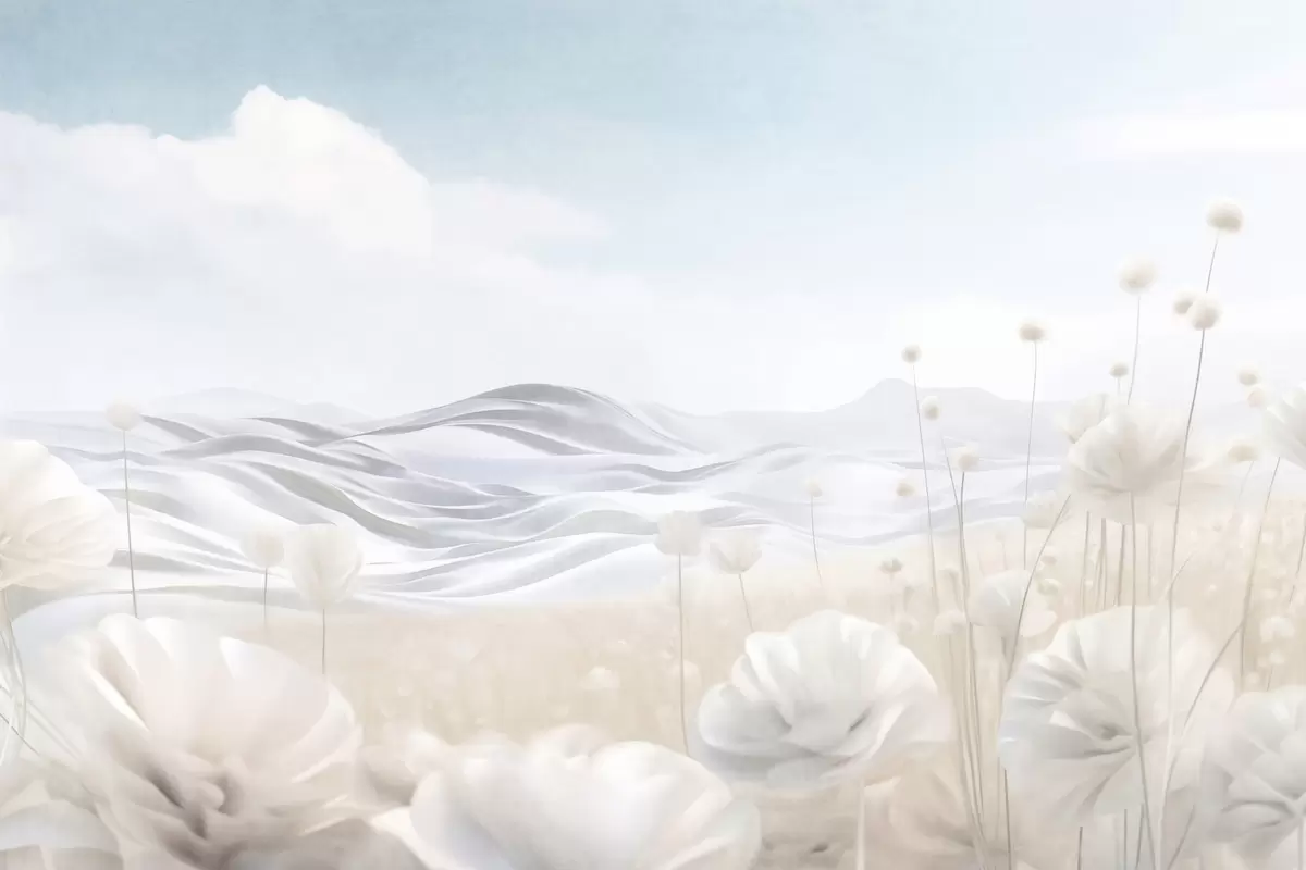 Fototapeten Strukturiertes Feld mit cremefarbenen Mohnblumen und sanften Hügeln unter einem hellblauen Himmel mit weichen Wolken, Pastellfarben N° w09553