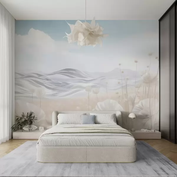 Fototapeten Strukturiertes Feld mit cremefarbenen Mohnblumen und sanften Hügeln unter einem hellblauen Himmel mit weichen Wolken, Pastellfarben N° w09553