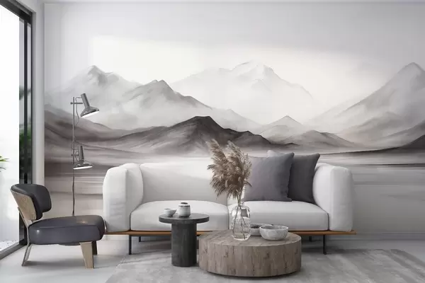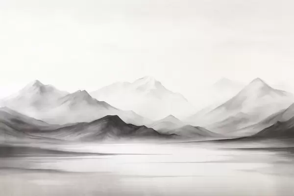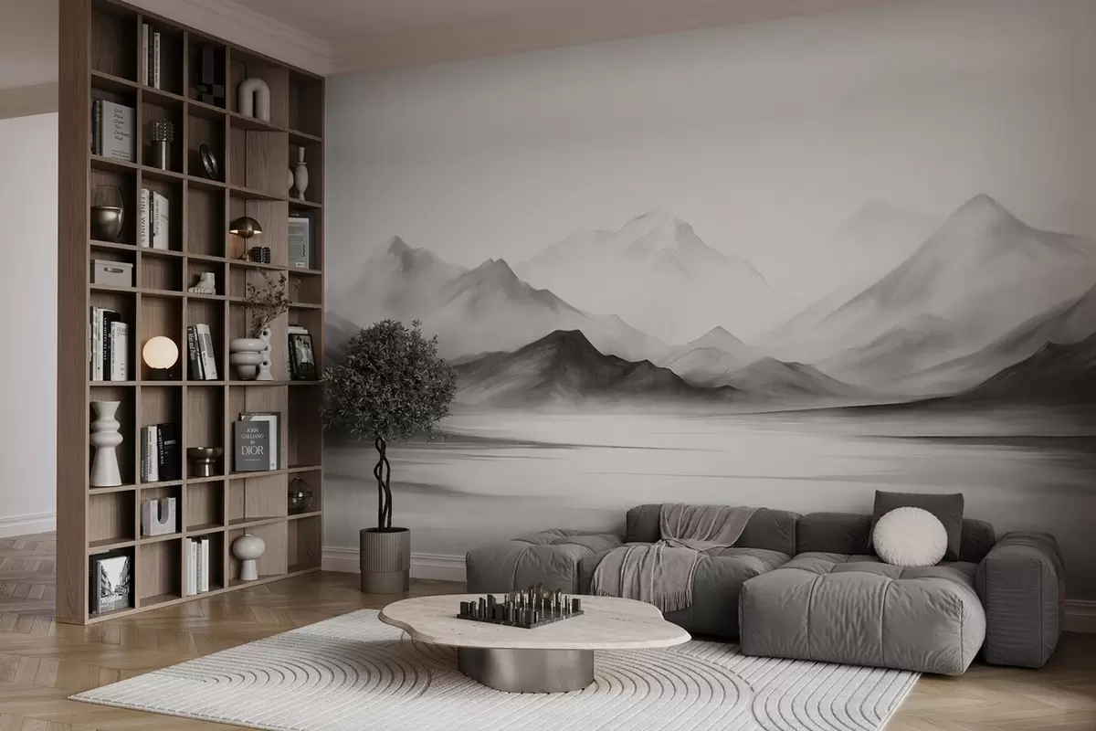 Fototapeten Eine monochrome, strukturierte Landschaft mit nebligen Bergen und einem See im Vordergrund N° w09555