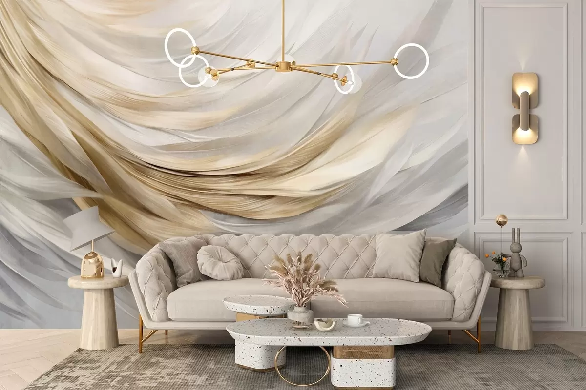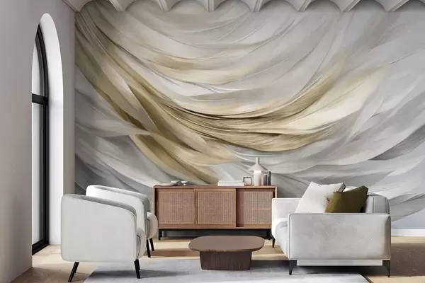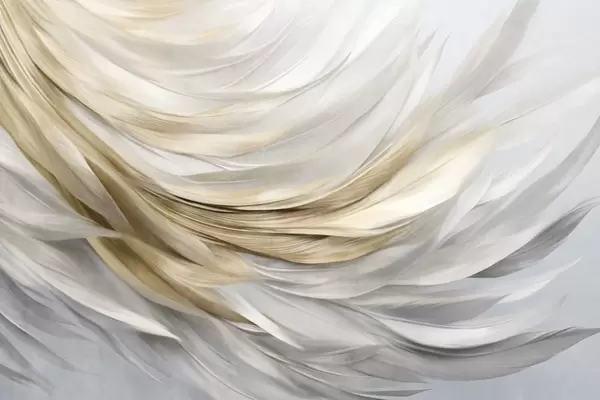 Fototapeten Abstrakte strukturierte weiße, graue und gelbe Federn, die ein fließendes, geschichtetes Muster vor einem hellen Hintergrund bilden. N° w09557