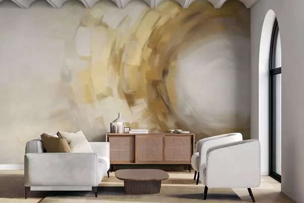 Fototapeten Abstrakte Malerei-Imitation mit kreisförmigen, strukturierten Pinselstrichen in Gelb und Weiß, die ein Gefühl von Bewegung erzeugen N° w09558