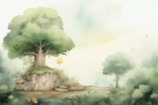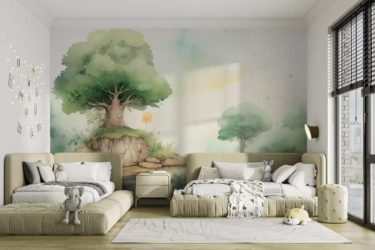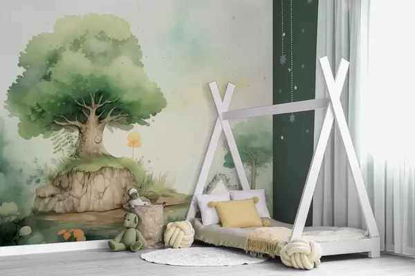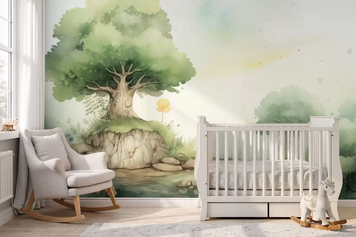 Fototapeten Eine märchenhafte Welt der Kindheit in einer grünen Waldlandschaft, im Aquarellstil N° w09566