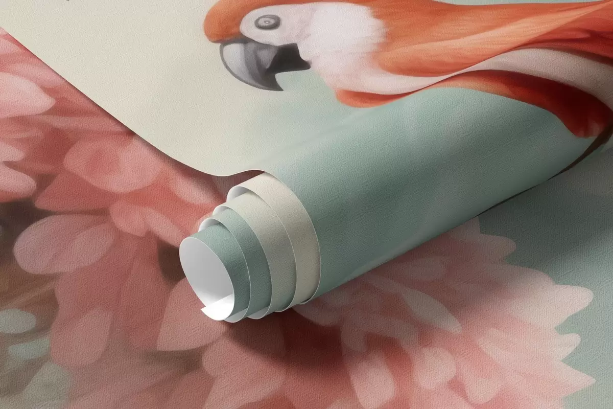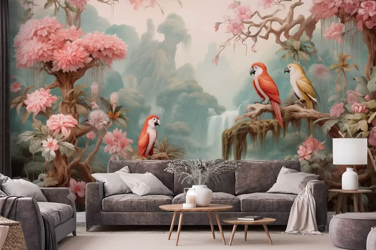 Fototapeten Ein märchenhafter tropischer Wald mit Papageien, blühenden Bäumen mit rosa Blüten und einem Wasserfall N° w09580