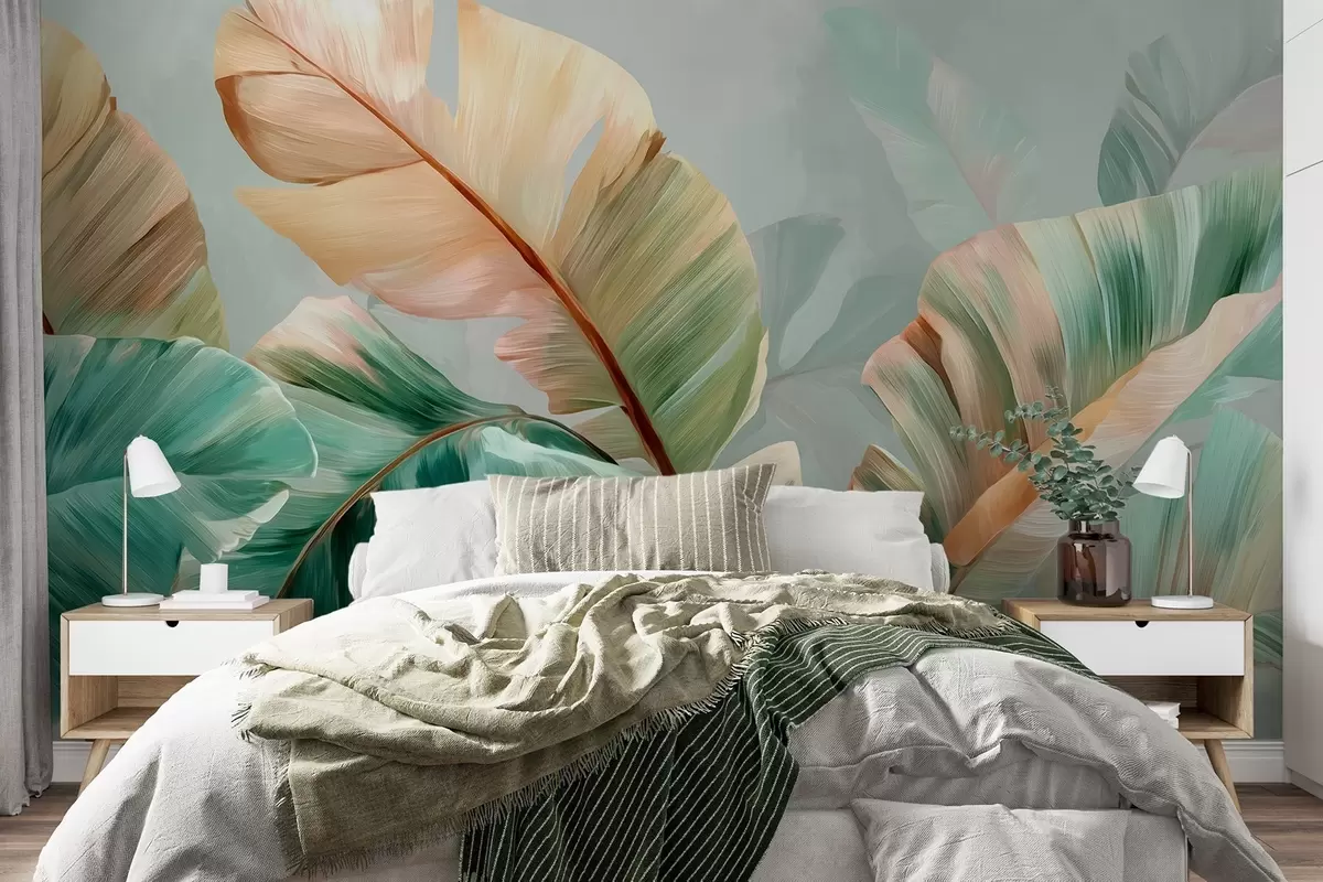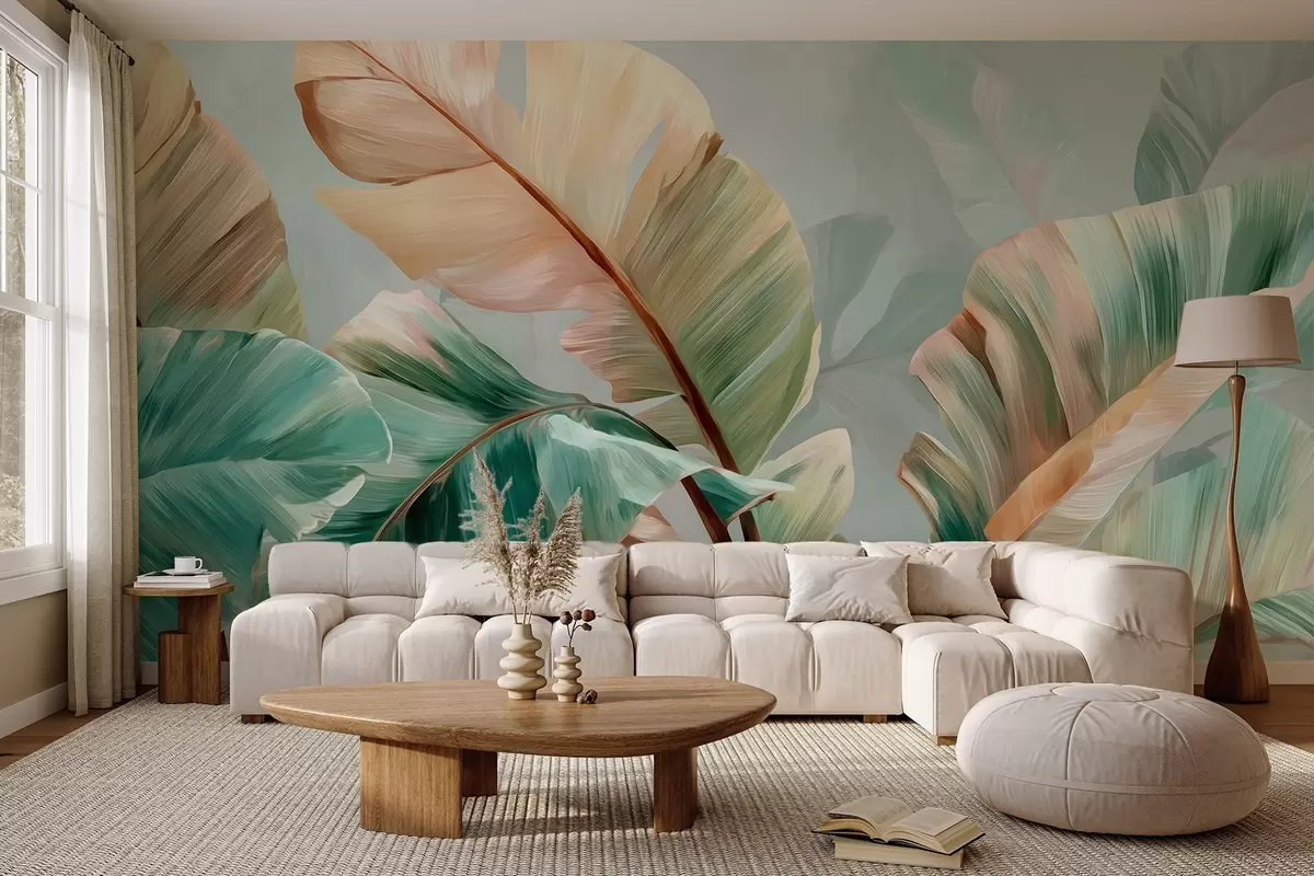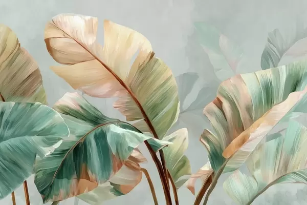 Fototapeten Zarte tropische Bananenblätter in pastellfarbenen Gelb-Grün-Tönen N° w09581