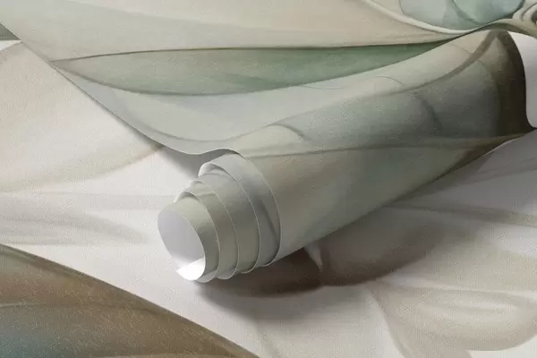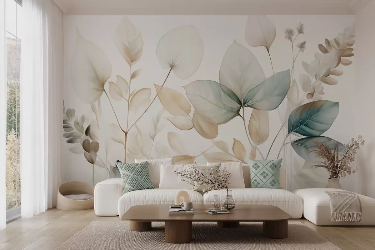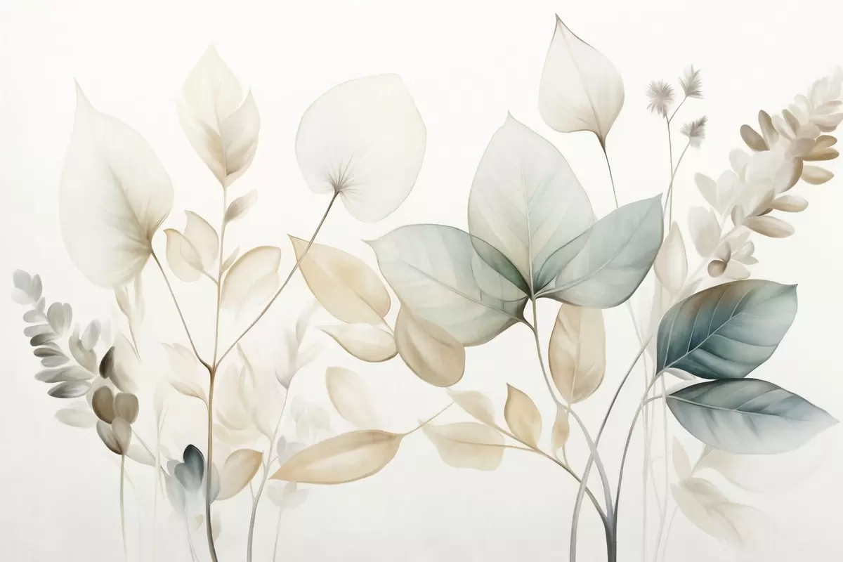 Fototapeten Strukturierte, durchscheinende Blätter in gedeckten Beige- und Blaugrüntönen, mit zarten Stielen vor einem weichen, hellen Hintergrund N° w09583