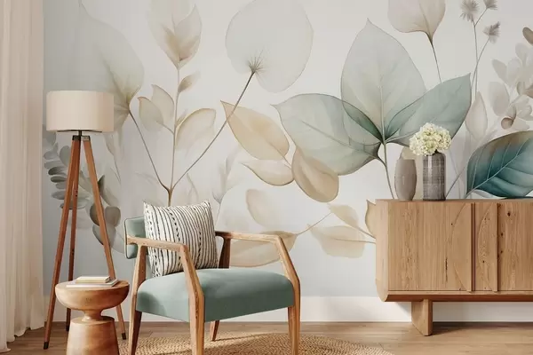 Fototapeten Strukturierte, durchscheinende Blätter in gedeckten Beige- und Blaugrüntönen, mit zarten Stielen vor einem weichen, hellen Hintergrund N° w09583
