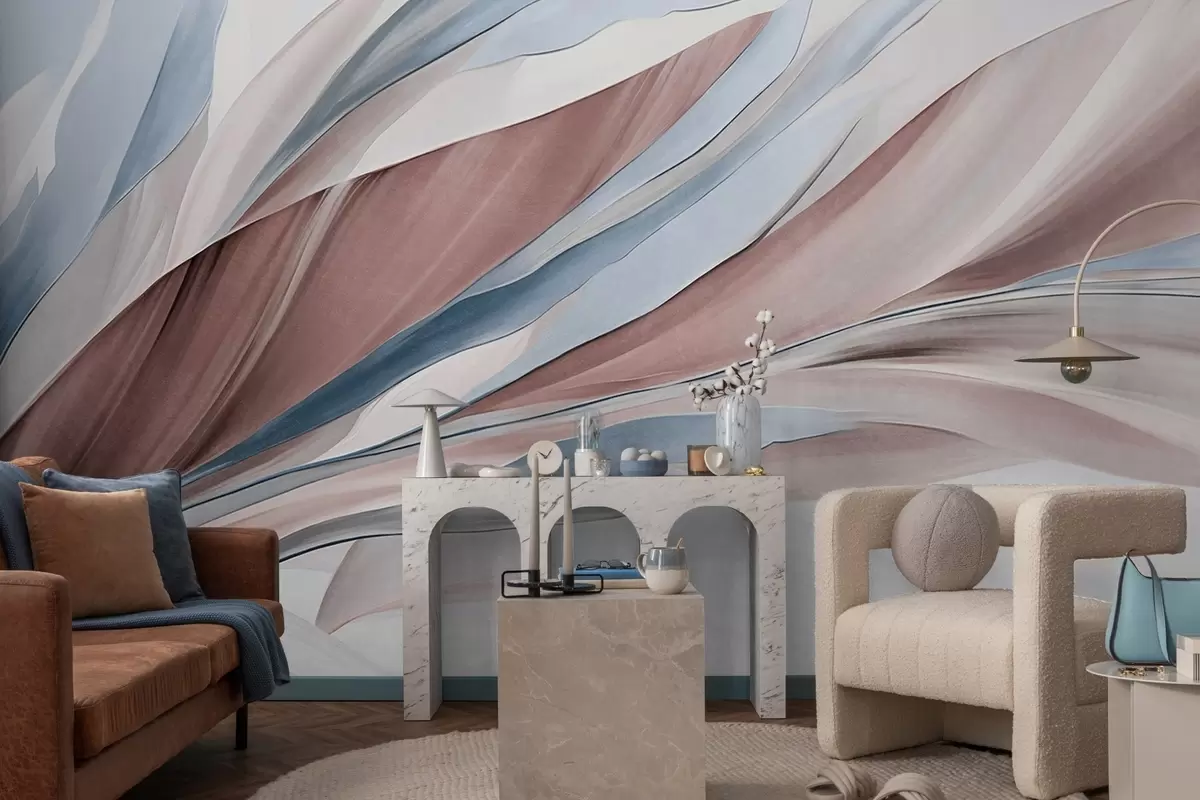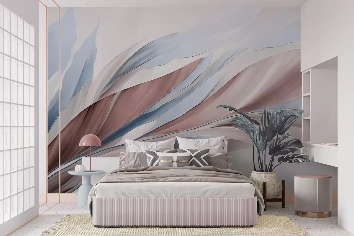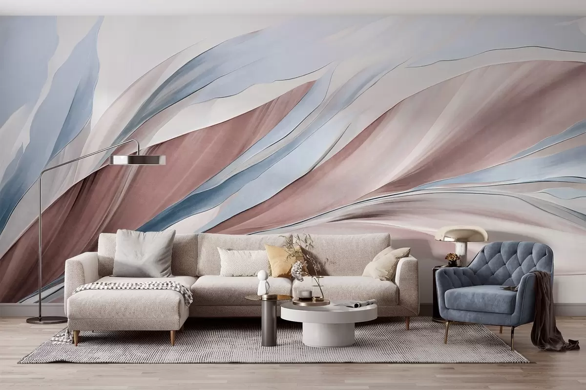 Fototapeten Abstrakte, fließende Wellen in Blau und Braun mit dünnen Formen und Linien vor weißem Hintergrund, strukturierte Kunst N° w09585v1