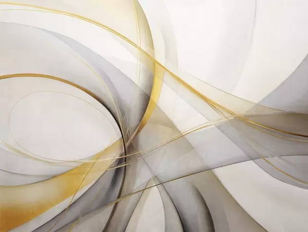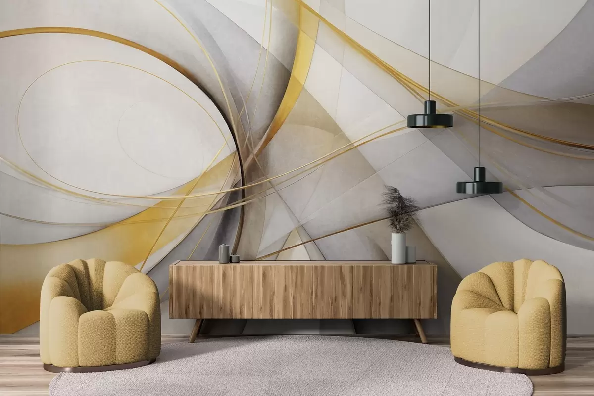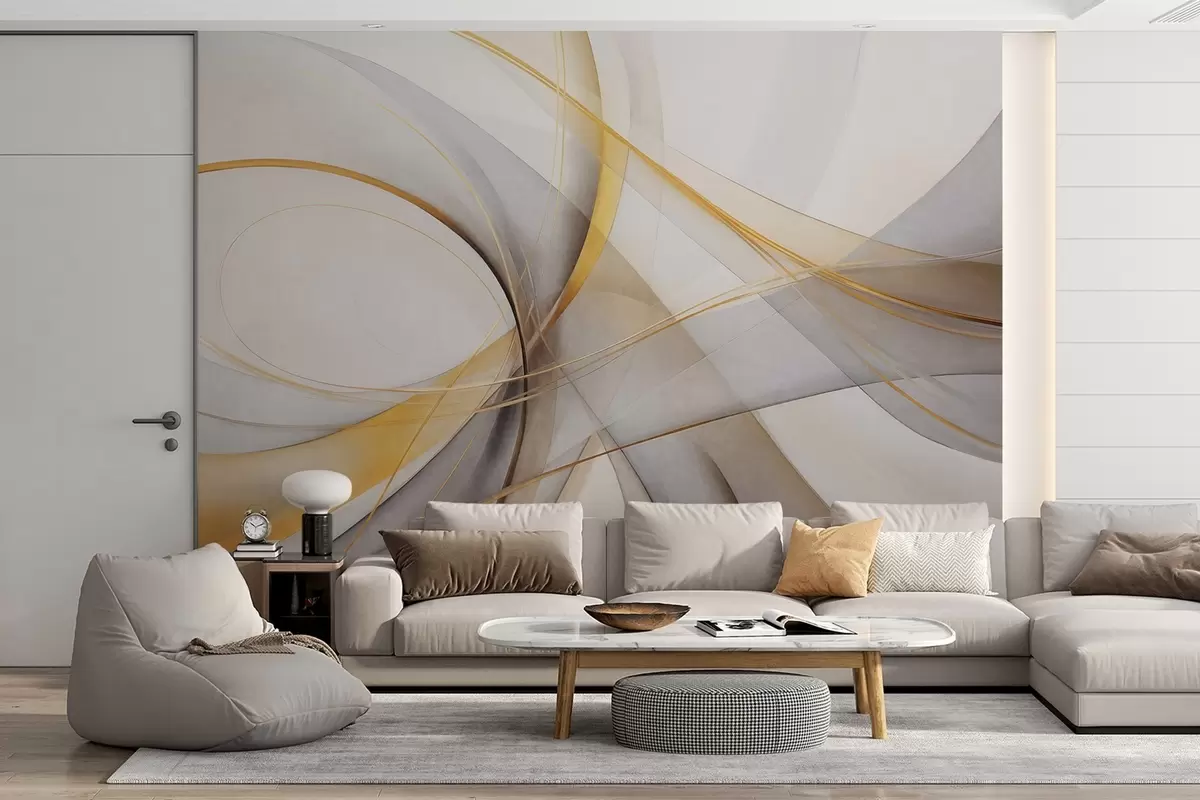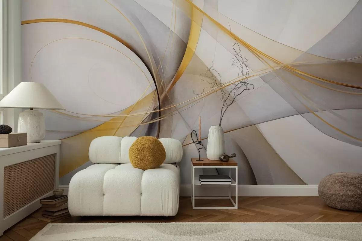 Fototapeten Abstrakte, fließende Linien in Gelb und Weiß auf grauem Hintergrund, mit einem Gefühl von Bewegung und Tiefe, moderne Kunst N° w09587