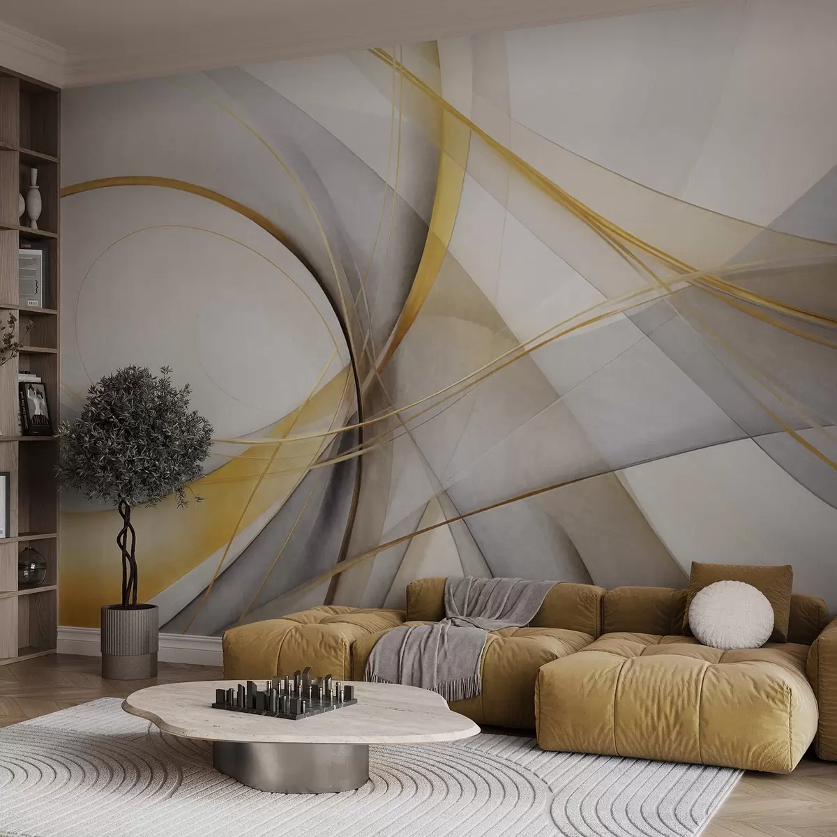 Fototapeten Abstrakte, fließende Linien in Gelb und Weiß auf grauem Hintergrund, mit einem Gefühl von Bewegung und Tiefe, moderne Kunst N° w09587