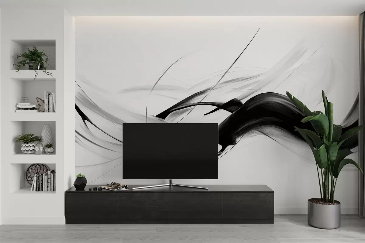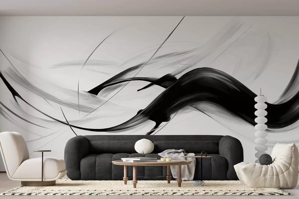 Fototapeten Abstrakte Schwarz-Weiß-Pinselstriche mit dünnen Linien, die ein modernes Design vor hellem Hintergrund bilden. N° w09605