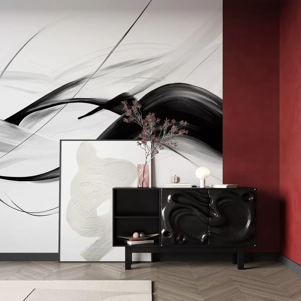 Fototapeten Abstrakte Schwarz-Weiß-Pinselstriche mit dünnen Linien, die ein modernes Design vor hellem Hintergrund bilden. N° w09605