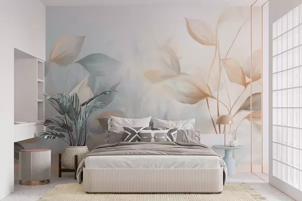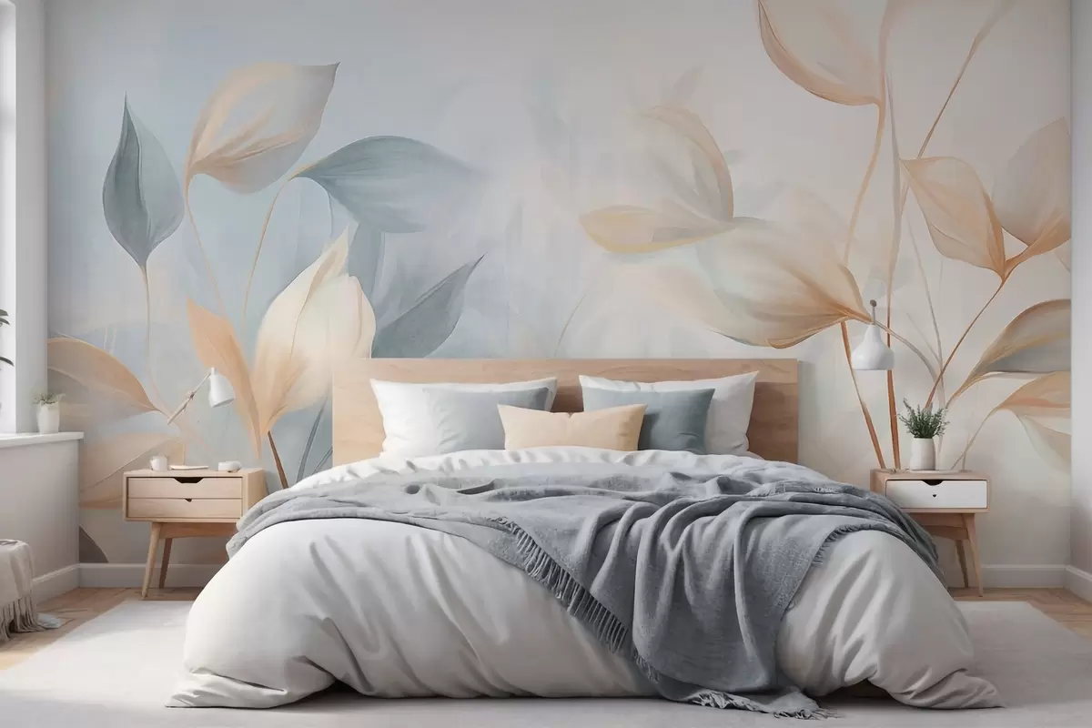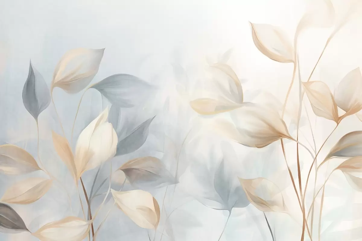 Fototapeten Weiche, zarte, durchscheinende Blätter in gedeckten Beige-, Pfirsich- und Hellblautönen, strukturierte Pastellkunst N° w09607