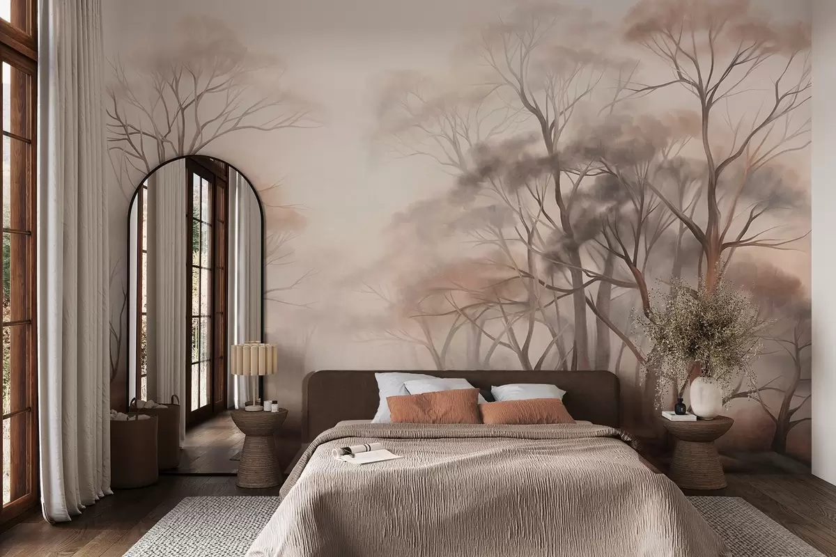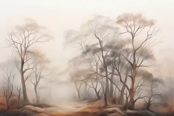 Fototapeten Strukturierte Bäume in einem nebligen Waldgebiet, neblige Landschaft mit gedämpften Farben und sanfter Beleuchtung N° w09609