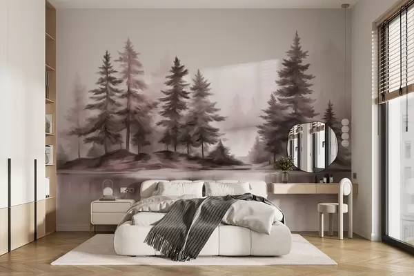 Fototapeten Ein strukturierter, nebliger Wald mit hohen Kiefern, gemalt in Imitationstechnik N° w09610v1