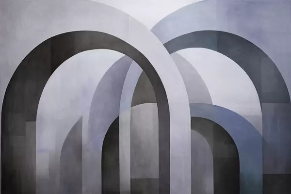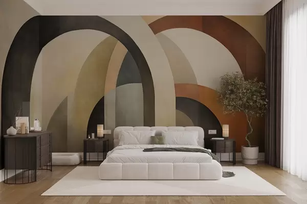 Fototapeten Abstrakte, strukturierte geometrische Bögen in erdigen Beige-, Braun- und Grautönen, ein vielschichtiges modernes architektonisches Design N° w09611