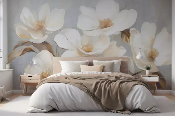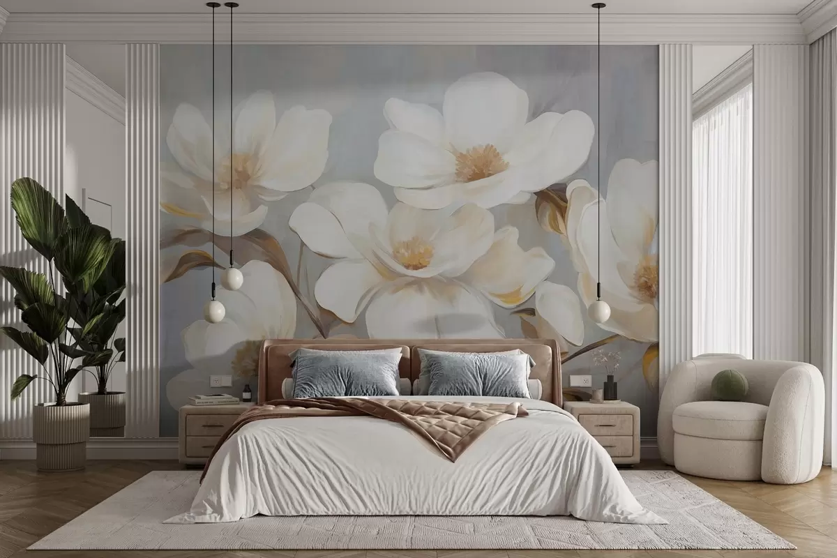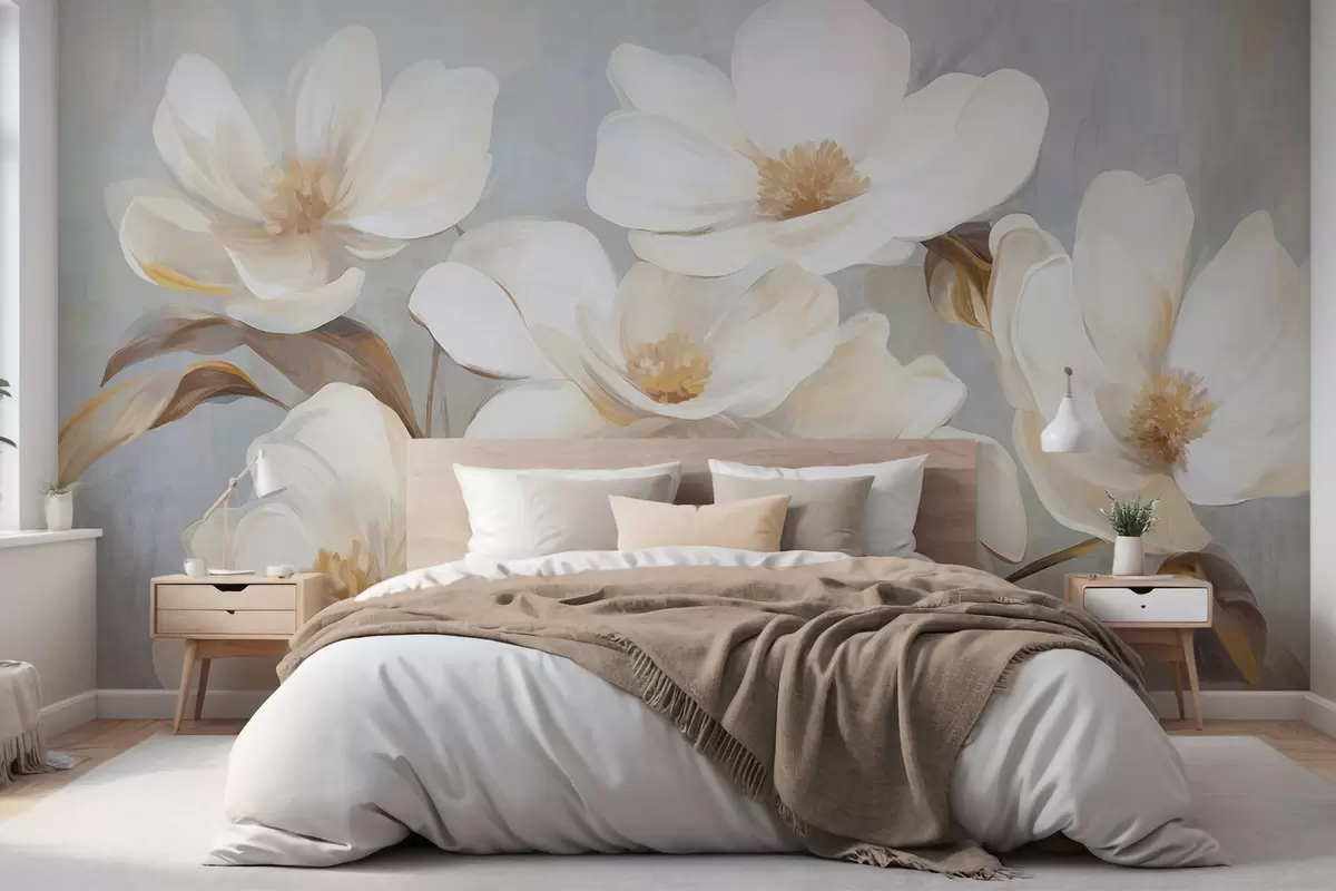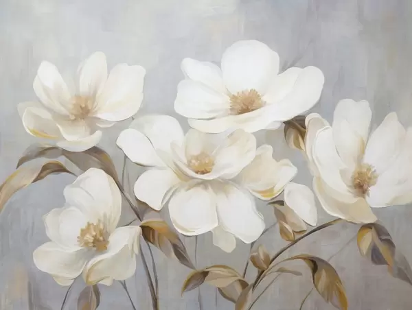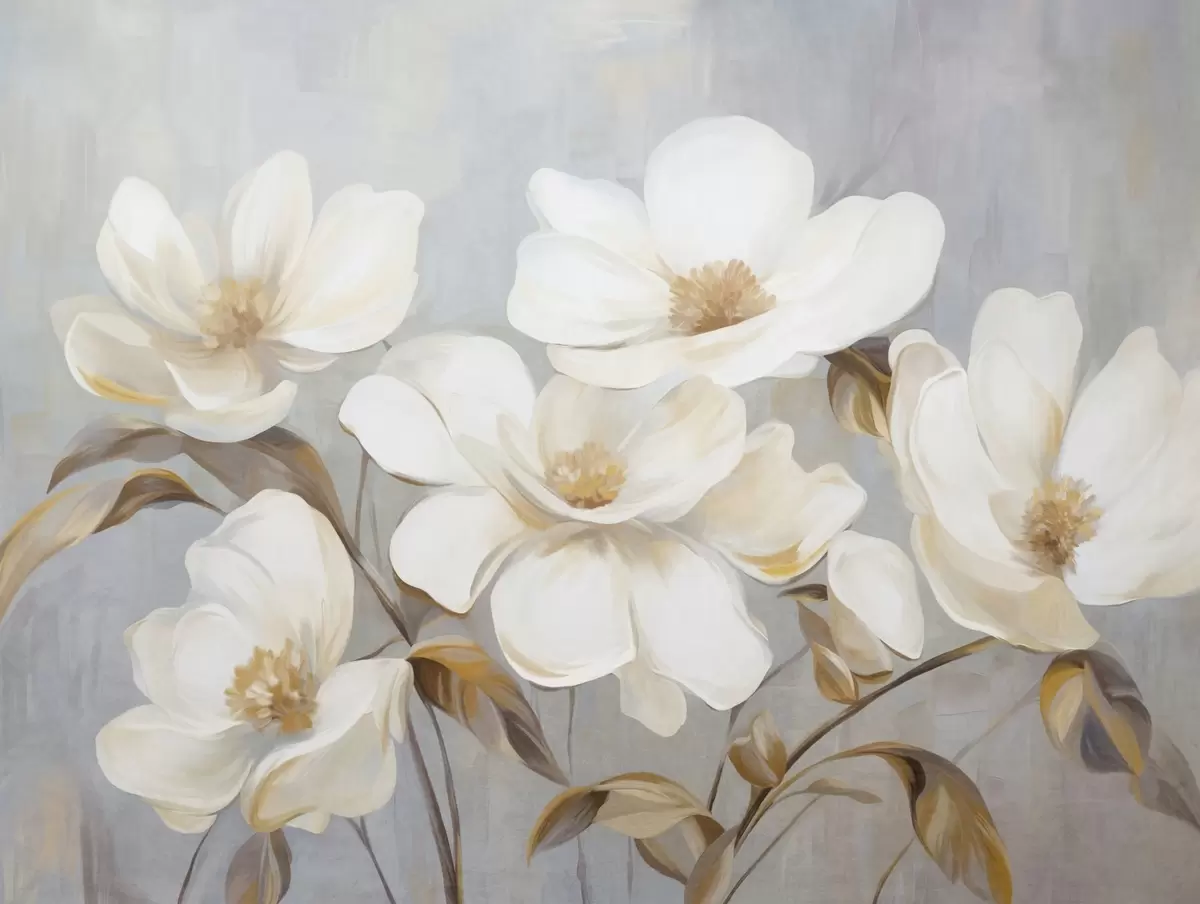 Fototapeten Eine strukturierte Malerei-Imitation mehrerer weißer Magnolienblüten vor einem gedämpften Pastellhintergrund N° w09612