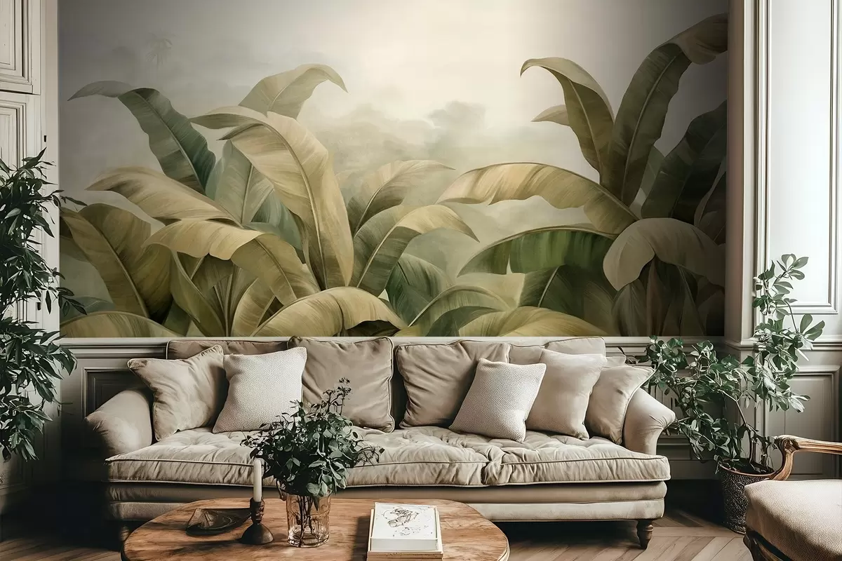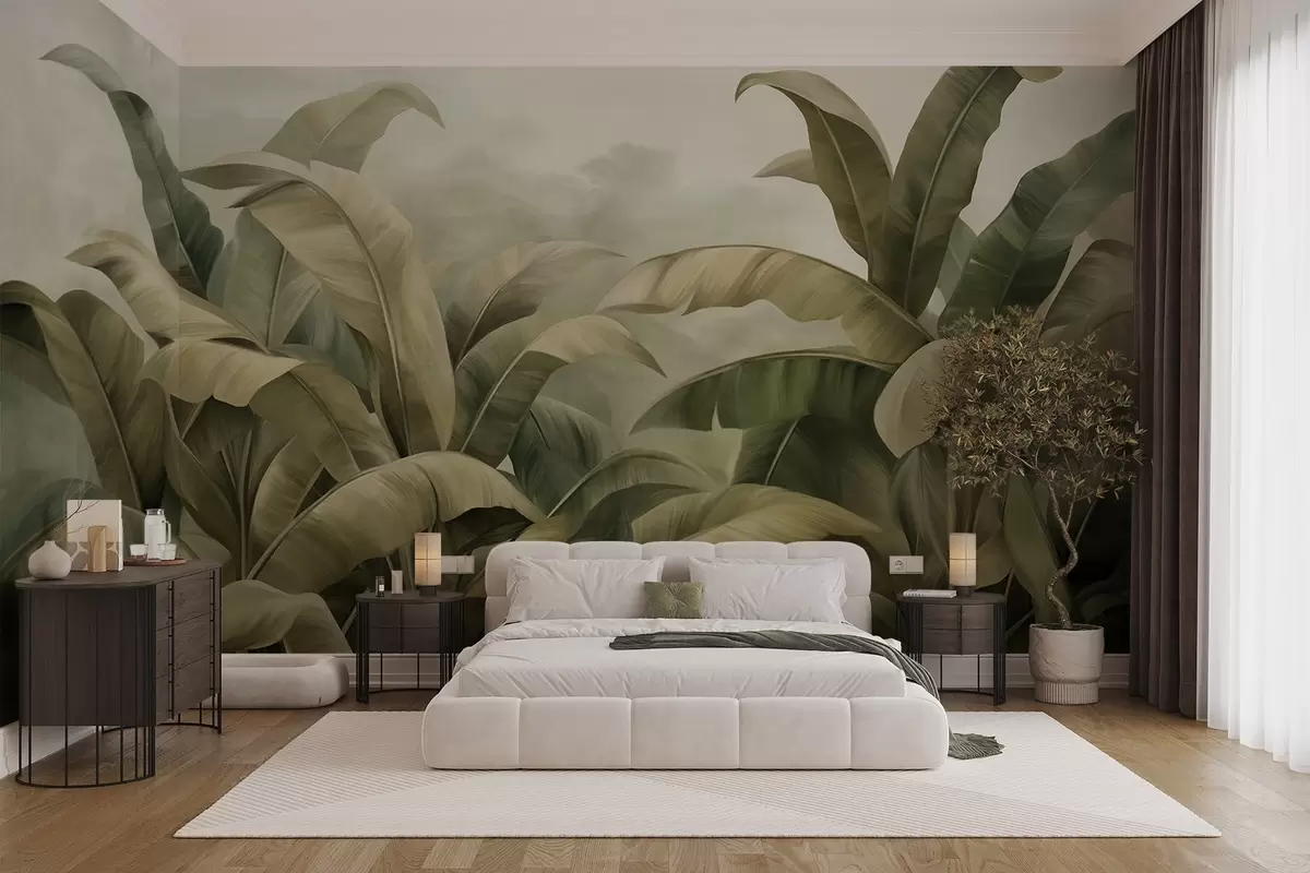 Fototapeten Strukturierte, dichte Dschungellandschaft mit großen Bananenblättern in gedeckten Grün- und Beigetönen N° w09613