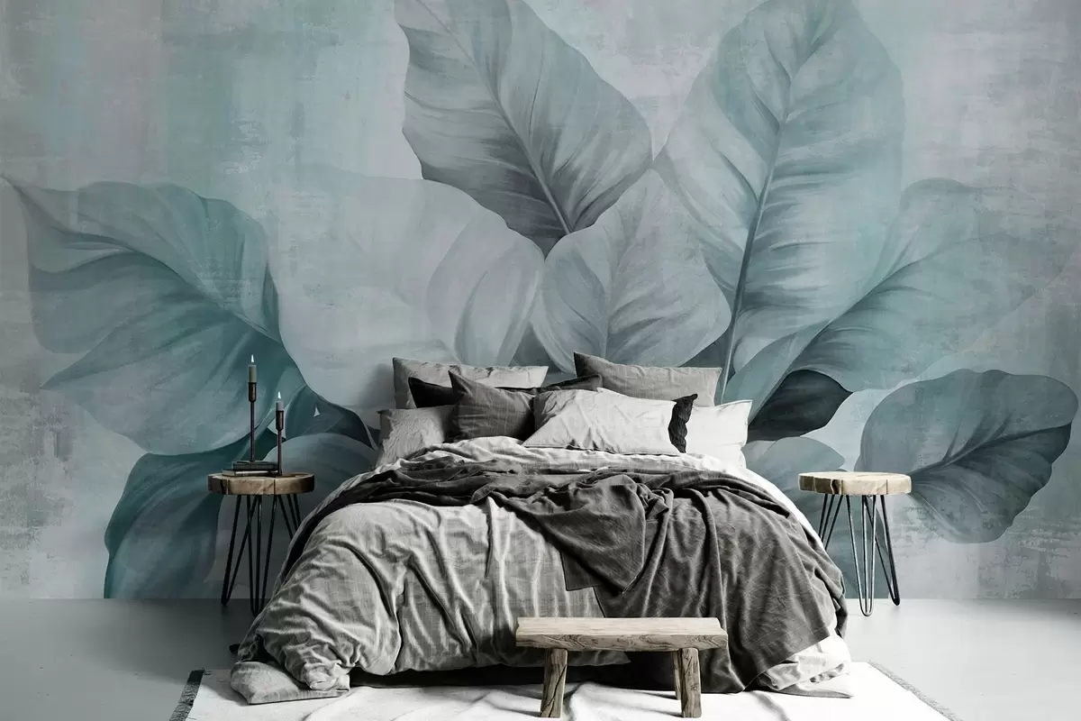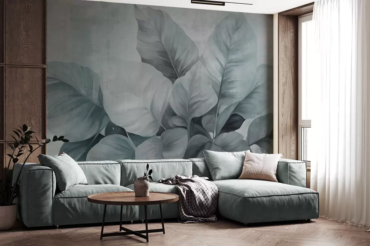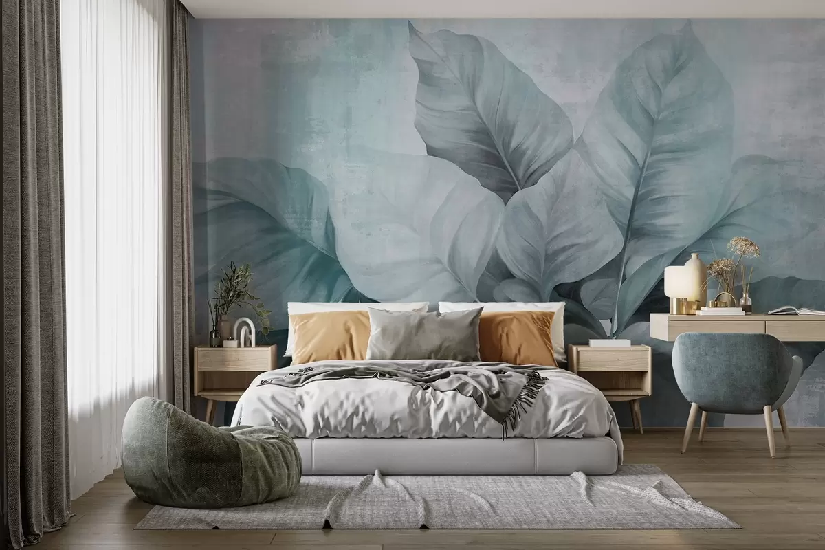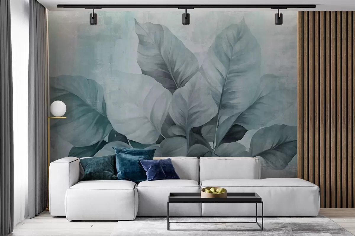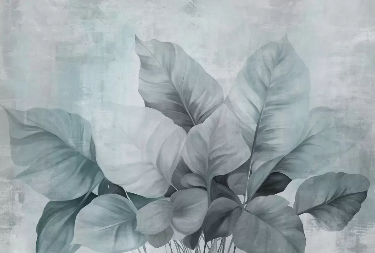 Fototapeten Strukturierte Malerei, die große, hellblaue Blätter vor einem neutralen Hintergrund mit subtilen Pinselstrichen imitiert. N° w09614v2