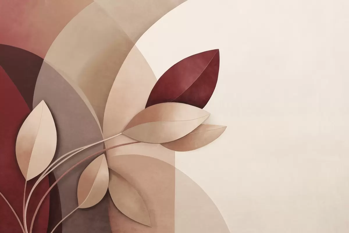 Fototapeten Abstrakter, strukturierter Ast mit Blättern in Braun-, Beige- und Rottönen vor einem Hintergrund aus abstrakten Formen N° w09618