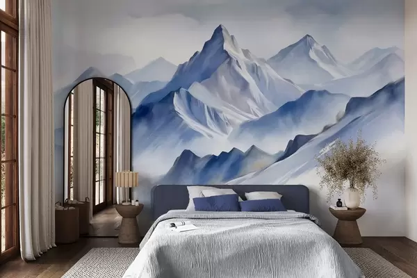 Fototapeten Strukturierte schneebedeckte Berge mit einem sanften Aquarelleffekt und einer Farbpalette aus Blau- und Weißtönen N° w09630