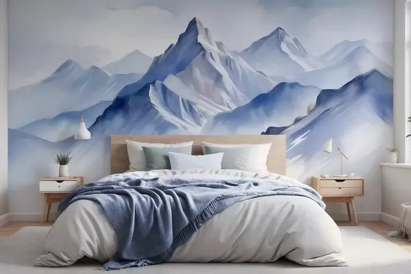 Fototapeten Strukturierte schneebedeckte Berge mit einem sanften Aquarelleffekt und einer Farbpalette aus Blau- und Weißtönen N° w09630