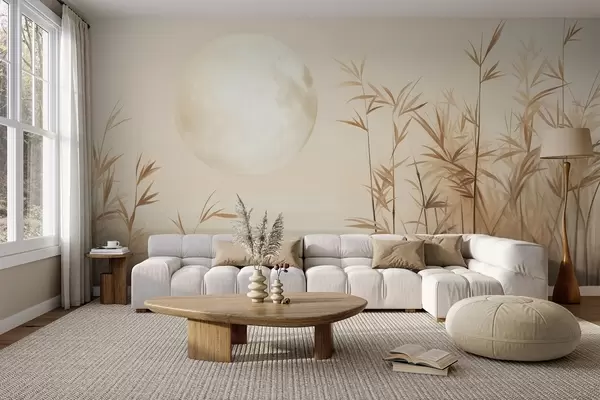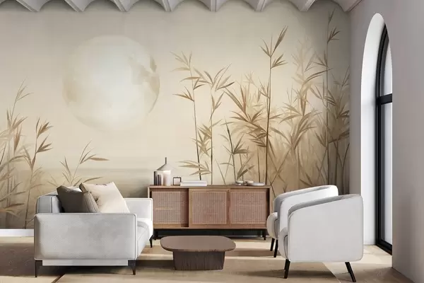 Fototapeten Strukturierte Landschaft mit hohem Schilf, See und blassem Mond an einem dunstigen Himmel N° w09631