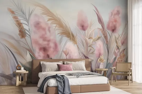 Fototapeten Rosa und beige Pampasgras und andere Trockenblumen vor einem sanften, dunstigen Himmel N° w09635