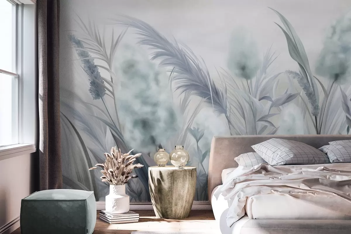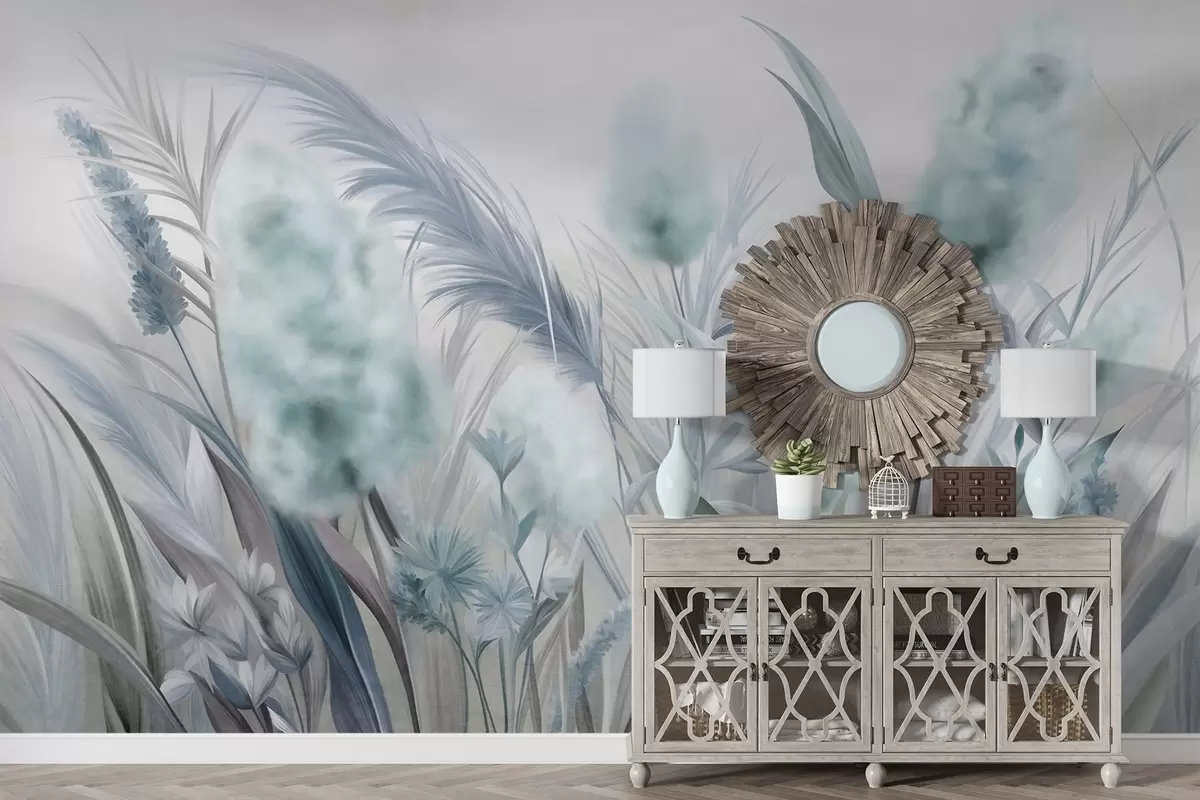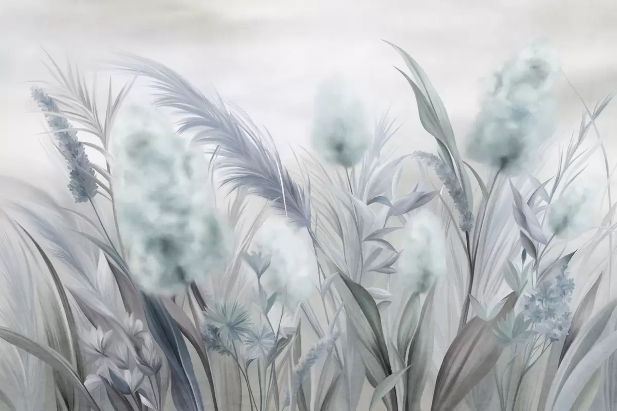 Fototapeten Blaues und graues Pampasgras und andere getrocknete Blumen vor einem sanften, dunstigen Himmel N° w09635v1
