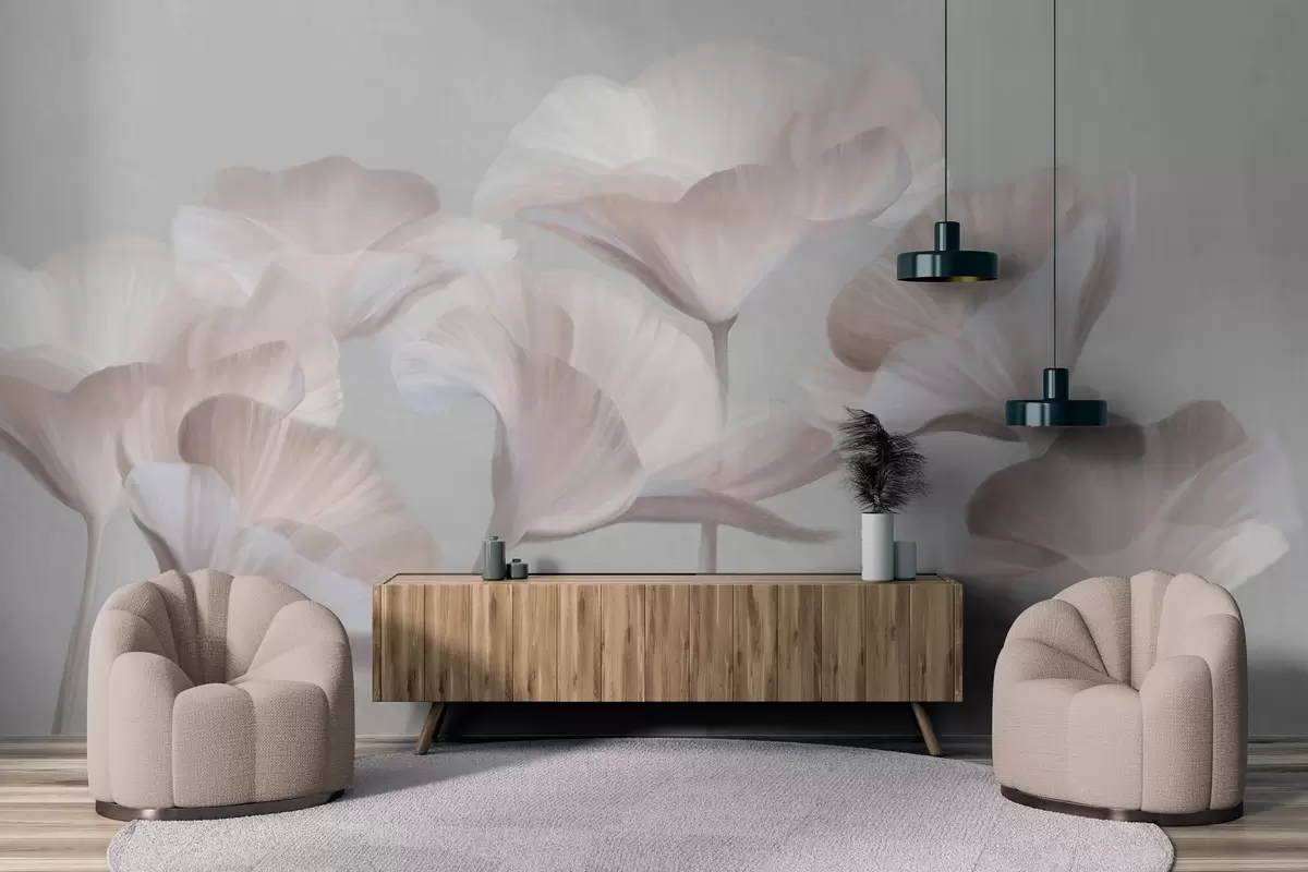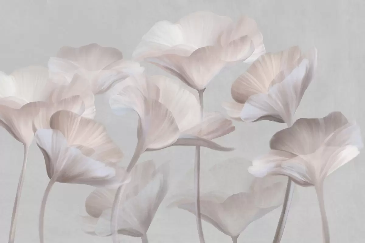 Fototapeten Blasspfirsichfarbene, strukturierte, durchscheinende Lotusblüten mit zarten Blütenblättern vor einem gedämpften grauen Hintergrund N° w09640