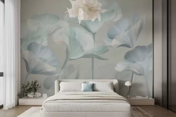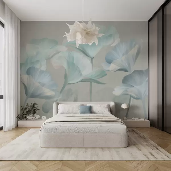 Fototapeten Hell türkisfarbene, strukturierte, durchscheinende Lotusblüten mit zarten Blütenblättern vor einem gedämpften grauen Hintergrund N° w09640v2